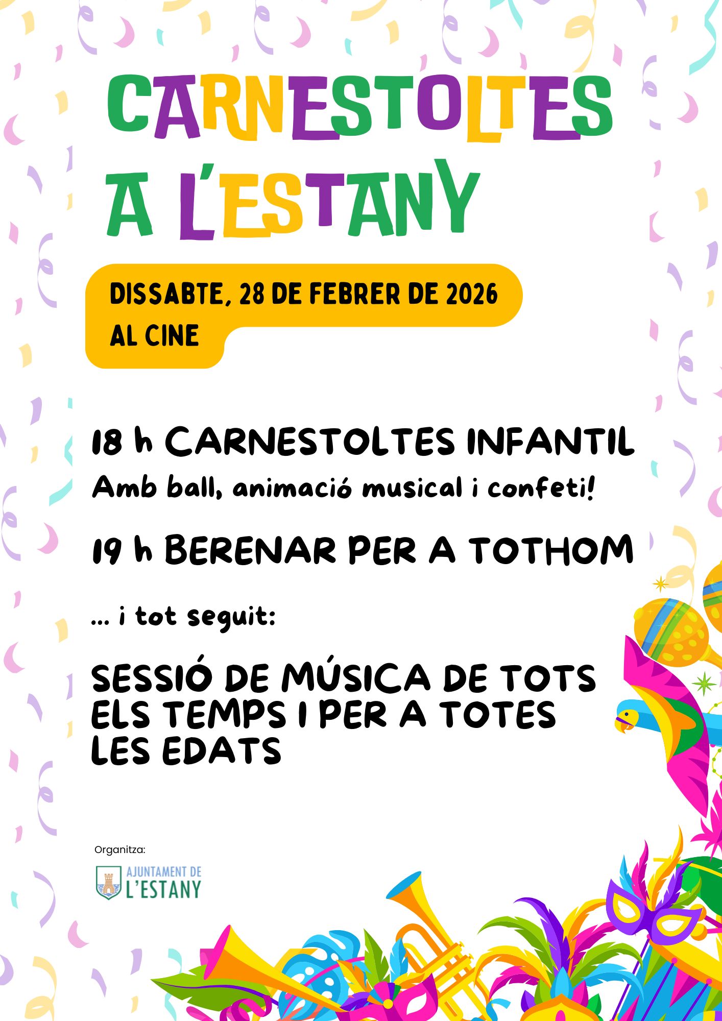 Carnestoltes infantil, animació, confeti, berenar i tot seguit música per a tothom! No t'ho perdis!