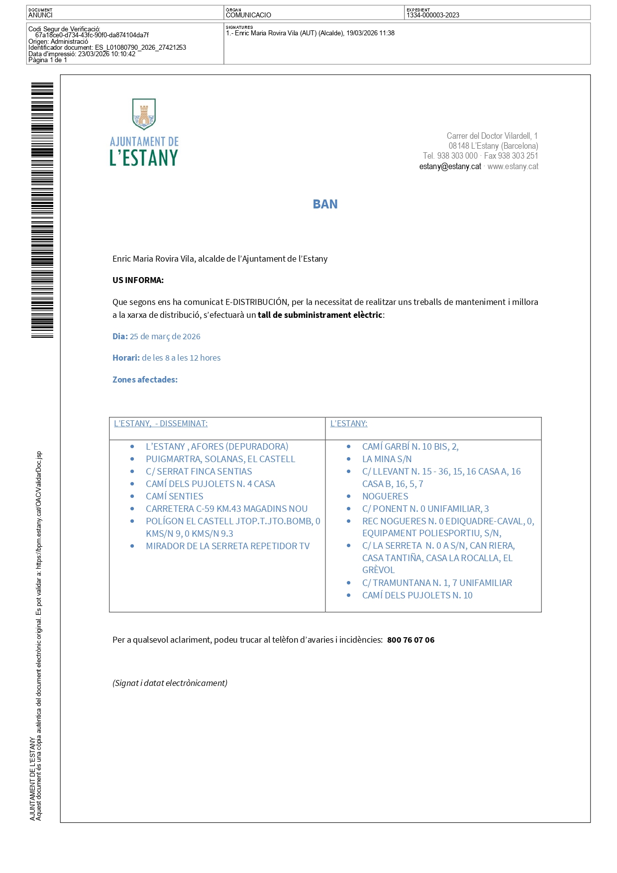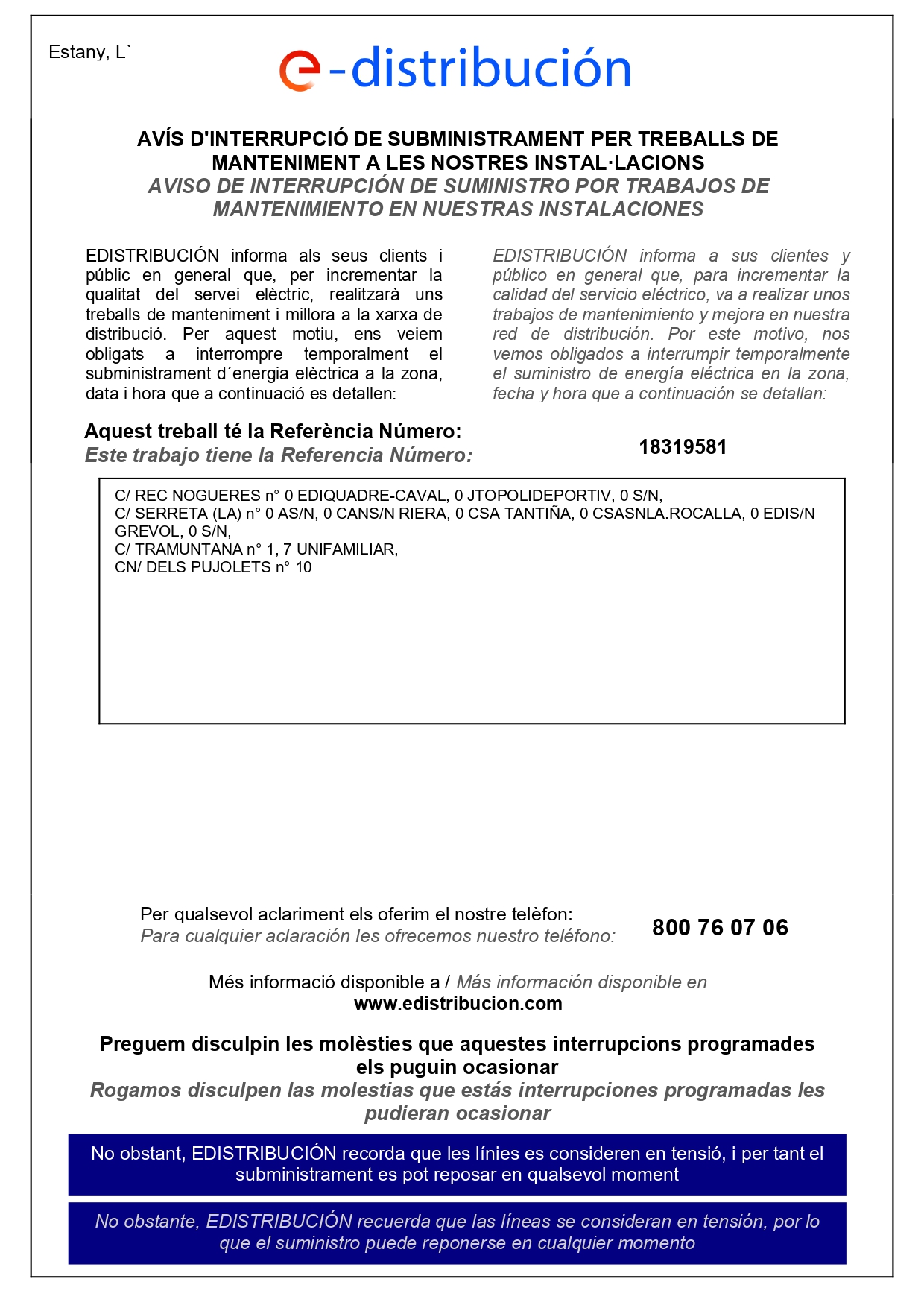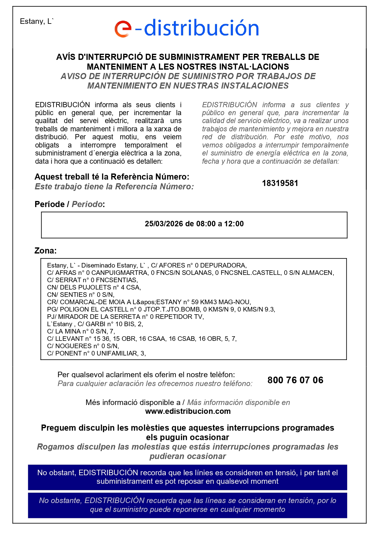 Per tasques de manteniment a la xarxa, l'empresa e-distribución comunica que aquest dimecres 25 de març de les 8h. del matí fins a les 12h. del migdia es tallarà el subministrament elèctric en diversos punts del municipi. Veure documents adjunts per conèixer els carrers afectats.
