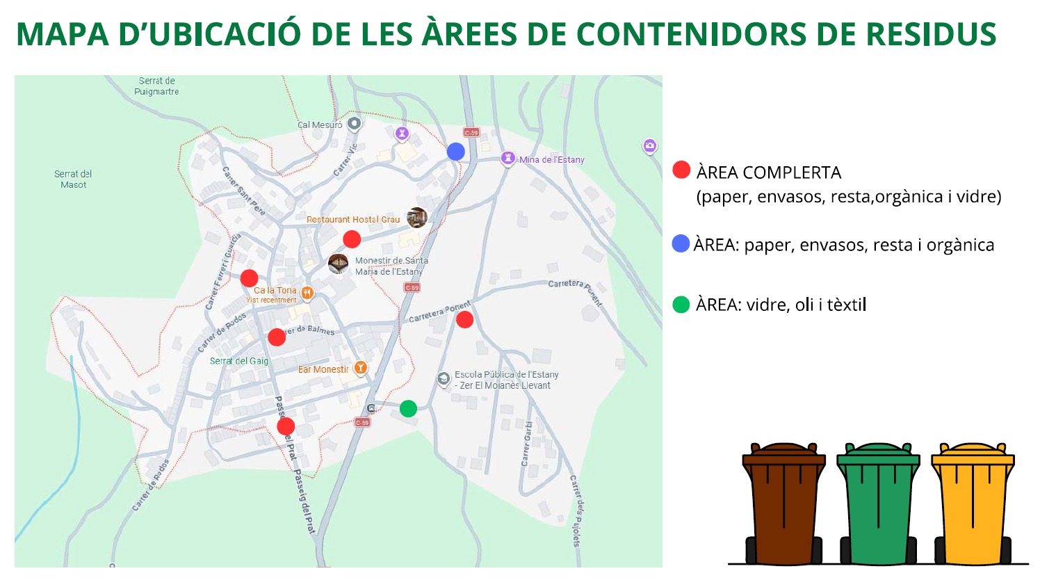 Així doncs, als carrers de l'Estany s'hi han instal·lat de nou els contenidors de resta/rebuig, orgànica, plàstic, cartró i vidre. Els contenidors de resta i orgànica estan equipats amb un sistema electrònic de tancament, i per obrir-los cal utilitzar la targeta que s'ha entregat a cada llar. L'orgànica es pot obrir cada dia utilitzant la targeta, mentre la fracció resta -el rebuig-, només es pot obrir mitjançant acreditació els diumenges. Els domicilis que tinguin bolquers de qualsevol classe per llençar, si ho sol·liciten els podran llençar diàriament. A continuació s'adjunta la ubicació al poble de les àrees de contenidors (cliqueu la imatge per ampliar).