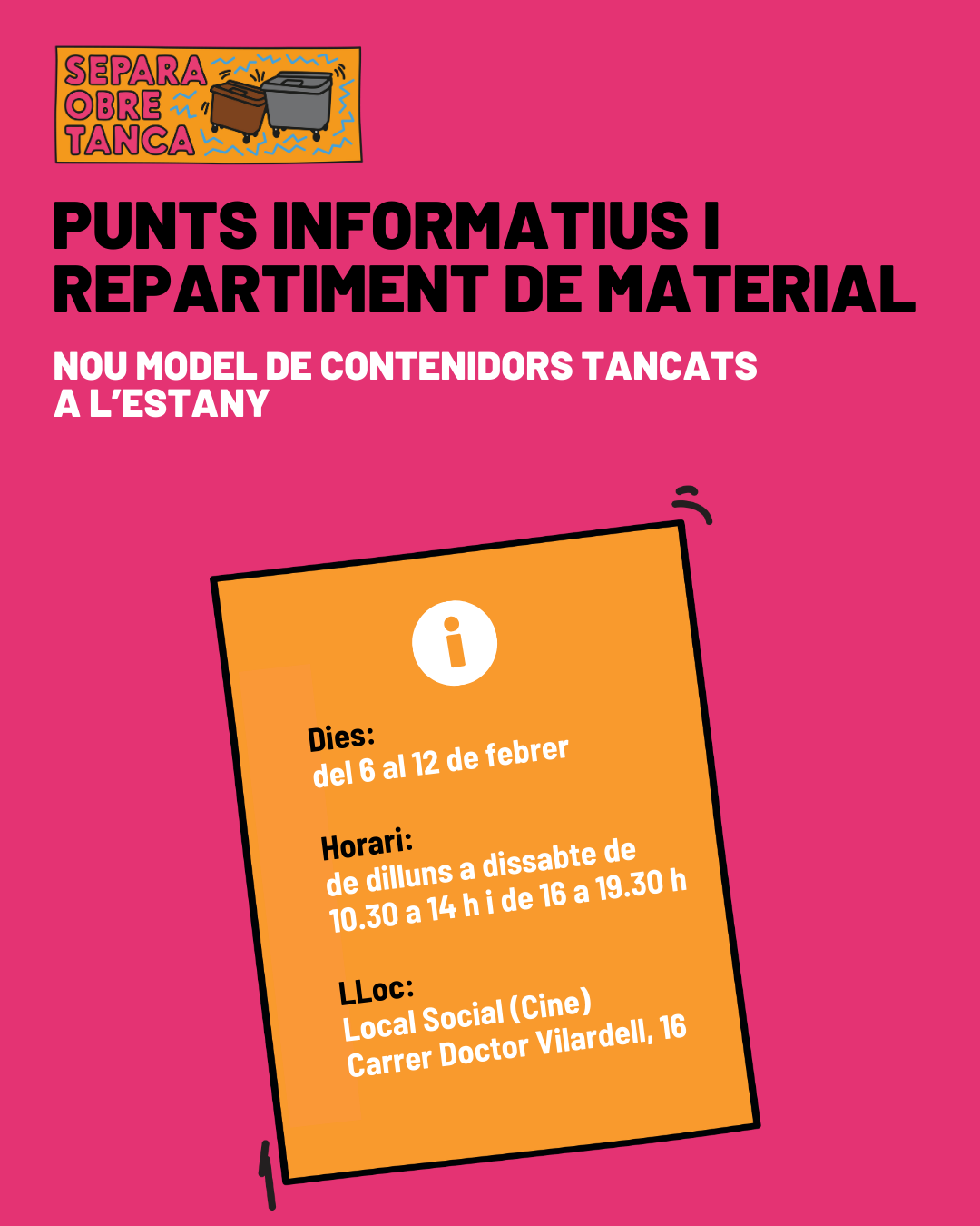Del 6 al 12 de febrer, el local social Cine serà el punt informatiu i d'entrega de les targetes per tal d'utilitzar el nou sistema de recollida de deixalles amb contenidors. L'horari d'atenció serà de dilluns a dissabte de 2/4 d'11 del matí a dues del migdia. I a les tardes, de les 4 fins a 2/4 de 8 del vespre. Per a rebre el kit -que inclou les targetes per obrir els contenidors de resta i orgànica- i fer el tràmit pertinent cal portar emplenada amb les dades corresponents la carta que els veïns i veïnes de l'Estany han rebut als seus domicilis.