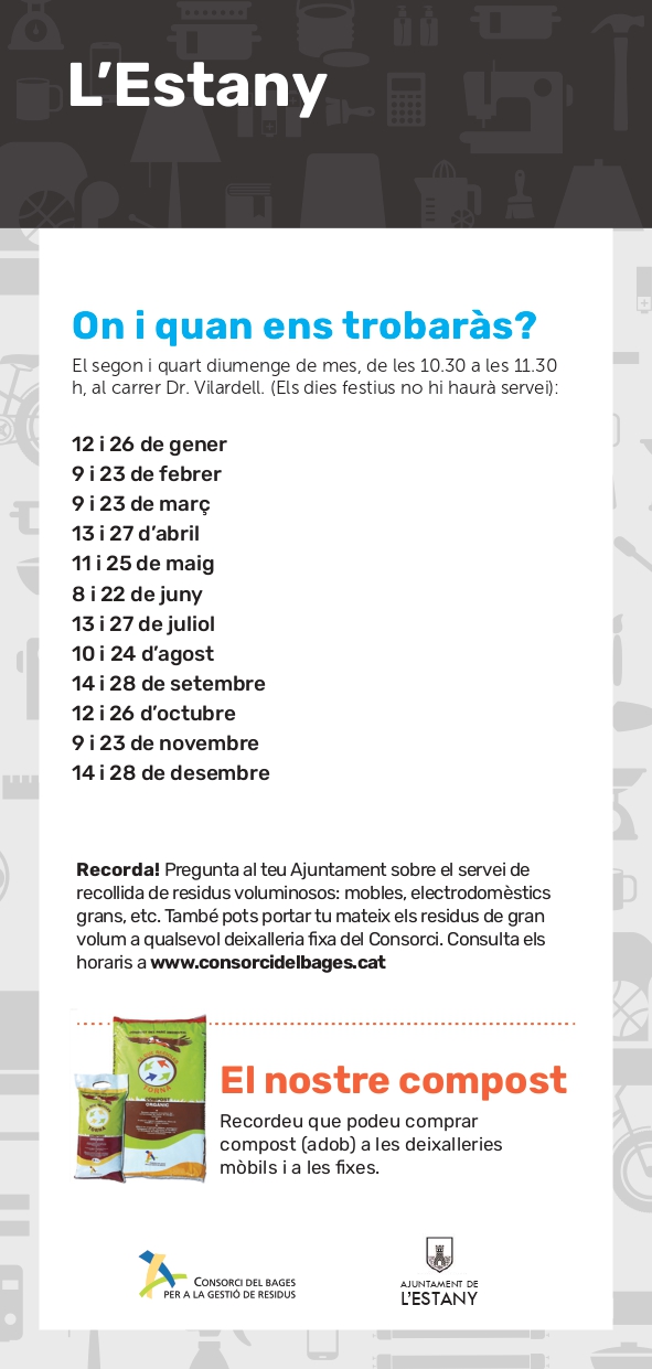La deixalleria mòbil és un furgó que recorre els municipis consorciats, al qual es poden portar residus de mida petita que no es poden llençar als contenidors. A l'Estany, dona el servei cada quinze dies.